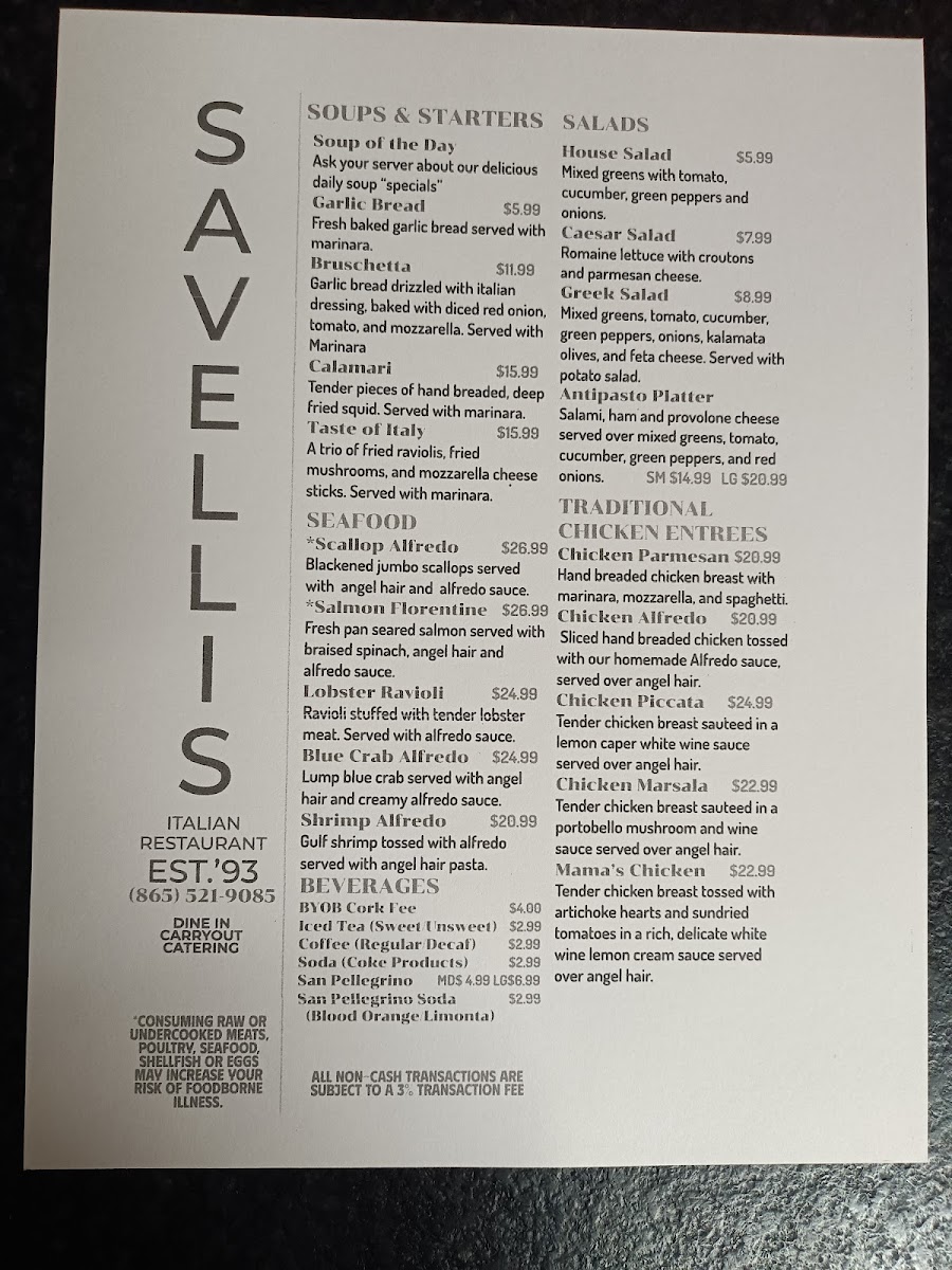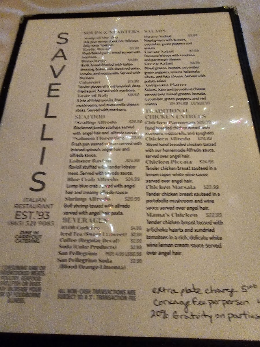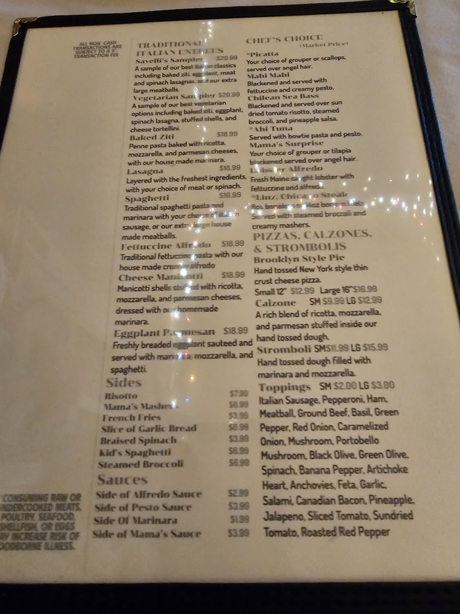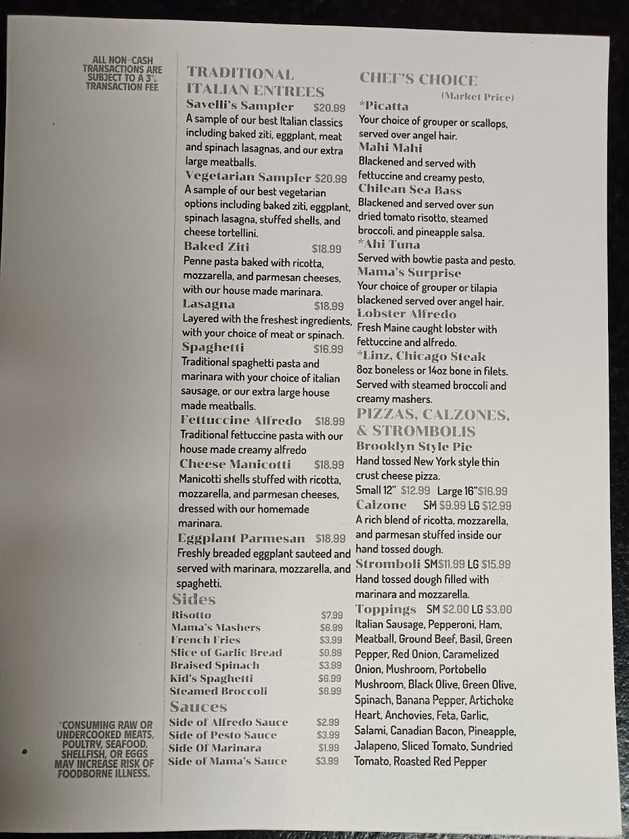 The menu at Savelli's Italian Restaurant features a variety of Italian and seafood dishes, complemented by a selection of pizzas, strombolis, and calzones. Diners can expect traditional Italian fare alongside seafood specialties and steakhouse options.