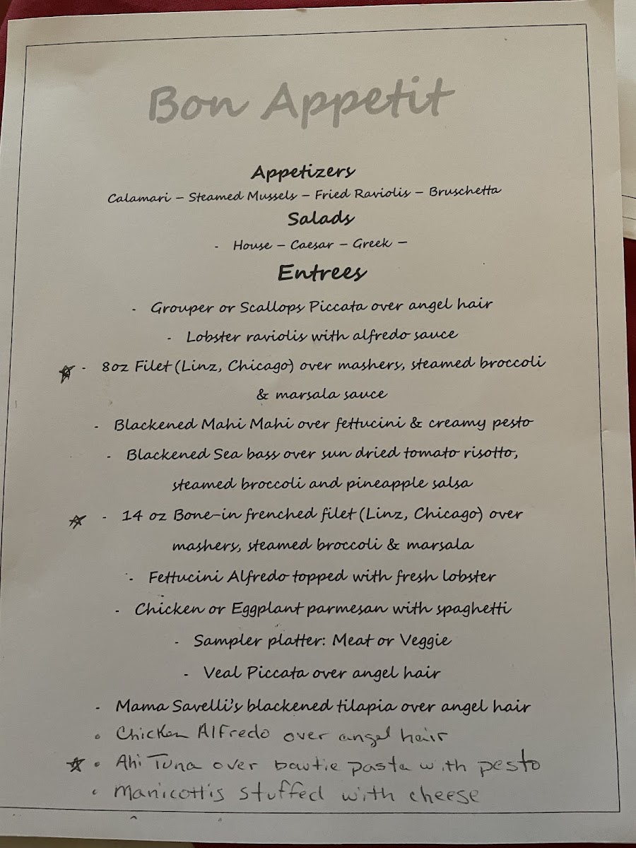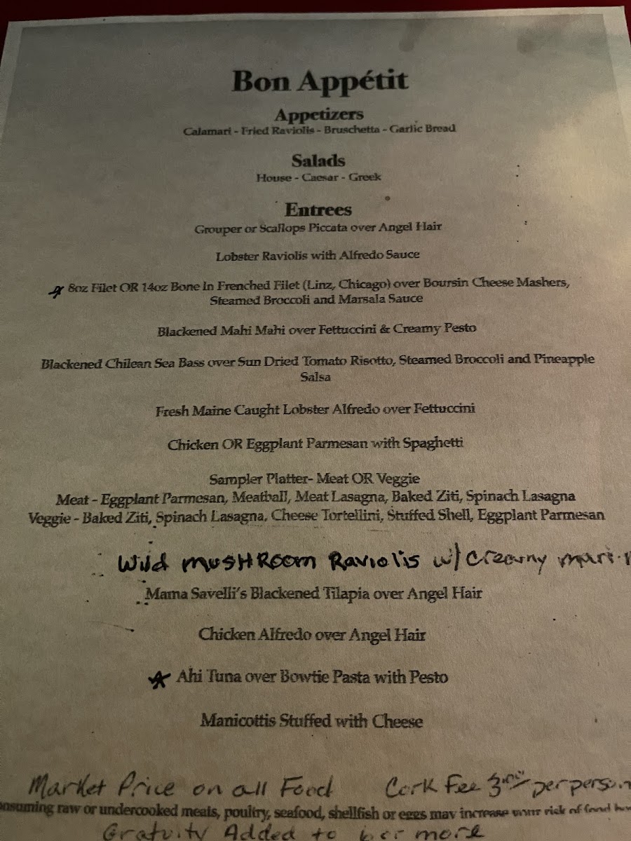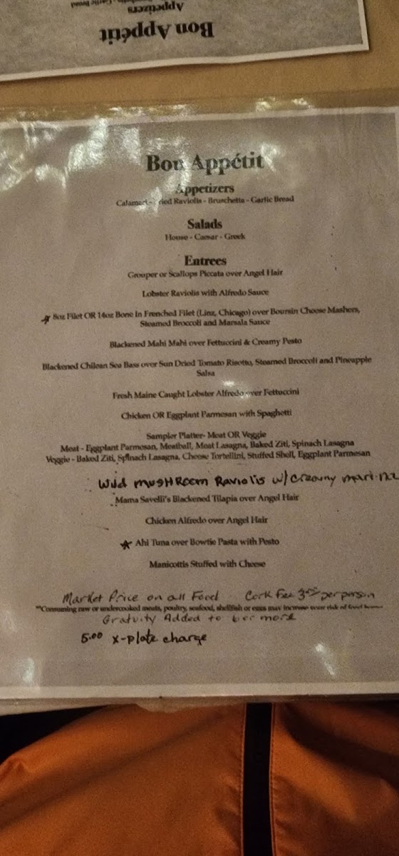 - Seafood: The seafood menu features dishes such as Blackened Scallop Alfredo, Salmon Florentine, and Lobster Ravioli, often served with pasta and creamy sauces. Specials like the Fish of the Day provide seasonal options.