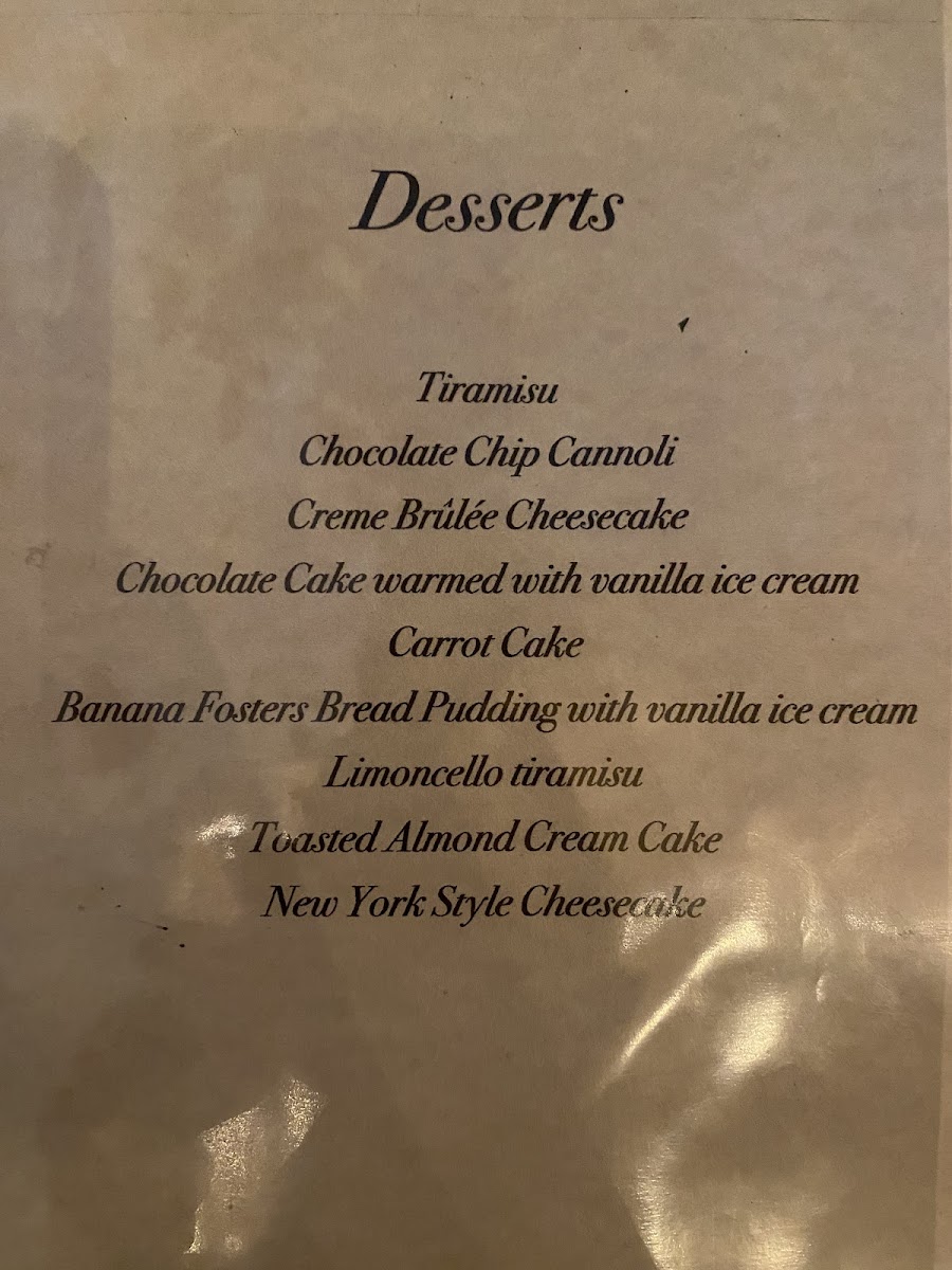 - Desserts: The dessert selection includes Italian classics such as Tiramisu, Lemon Mascarpone Cake, Key Lime Pie, and Lava Cake.
